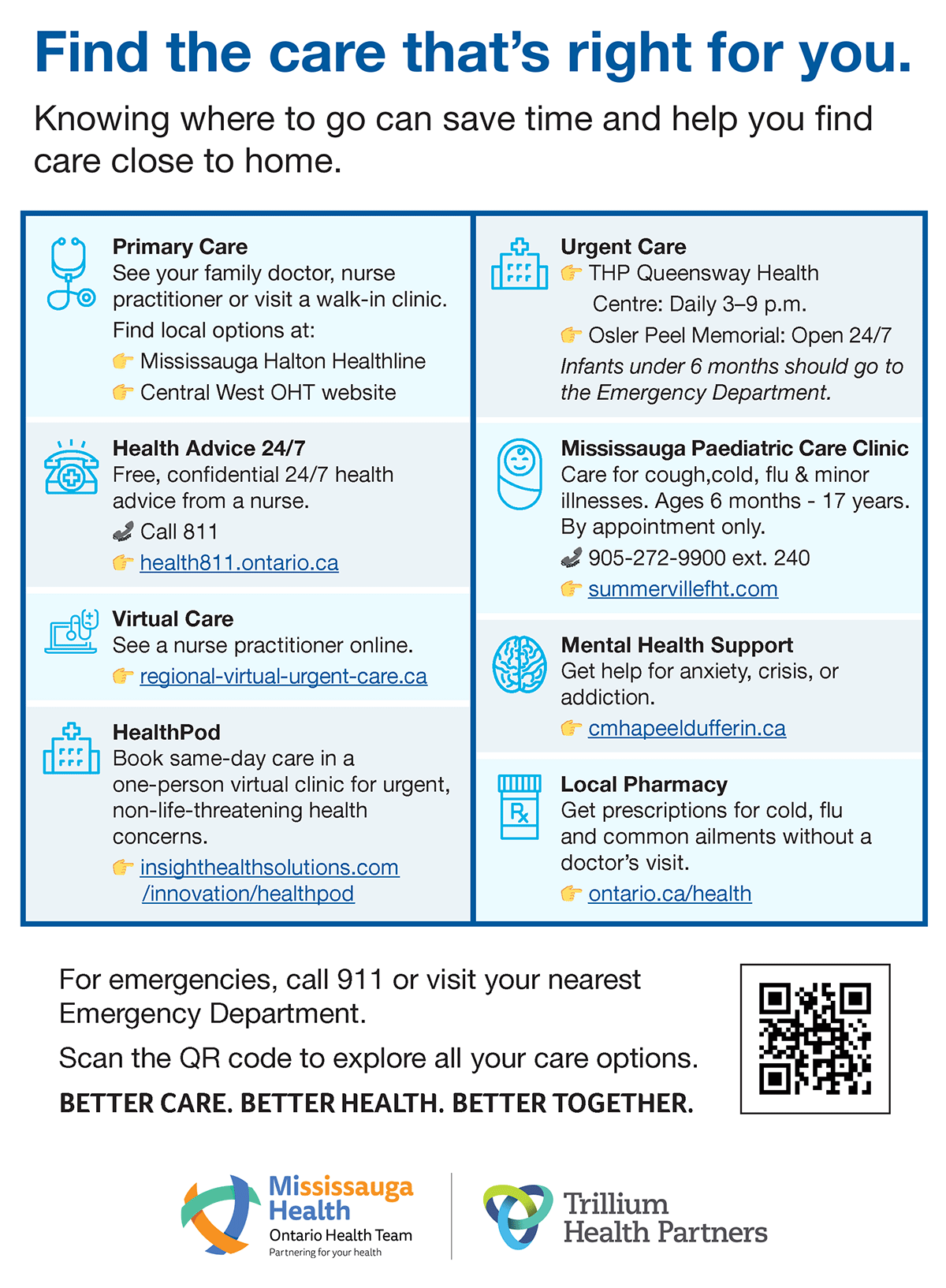 If you do not require emergency care, there are options available to you within the community, based on your needs. Below you will find resources that may be a better option than the hospital’s Emergency Departments.